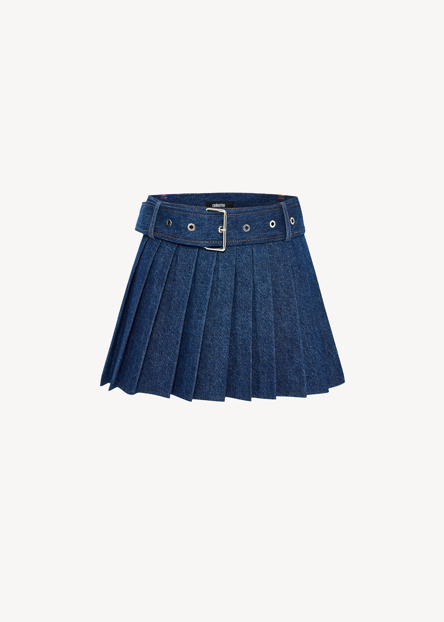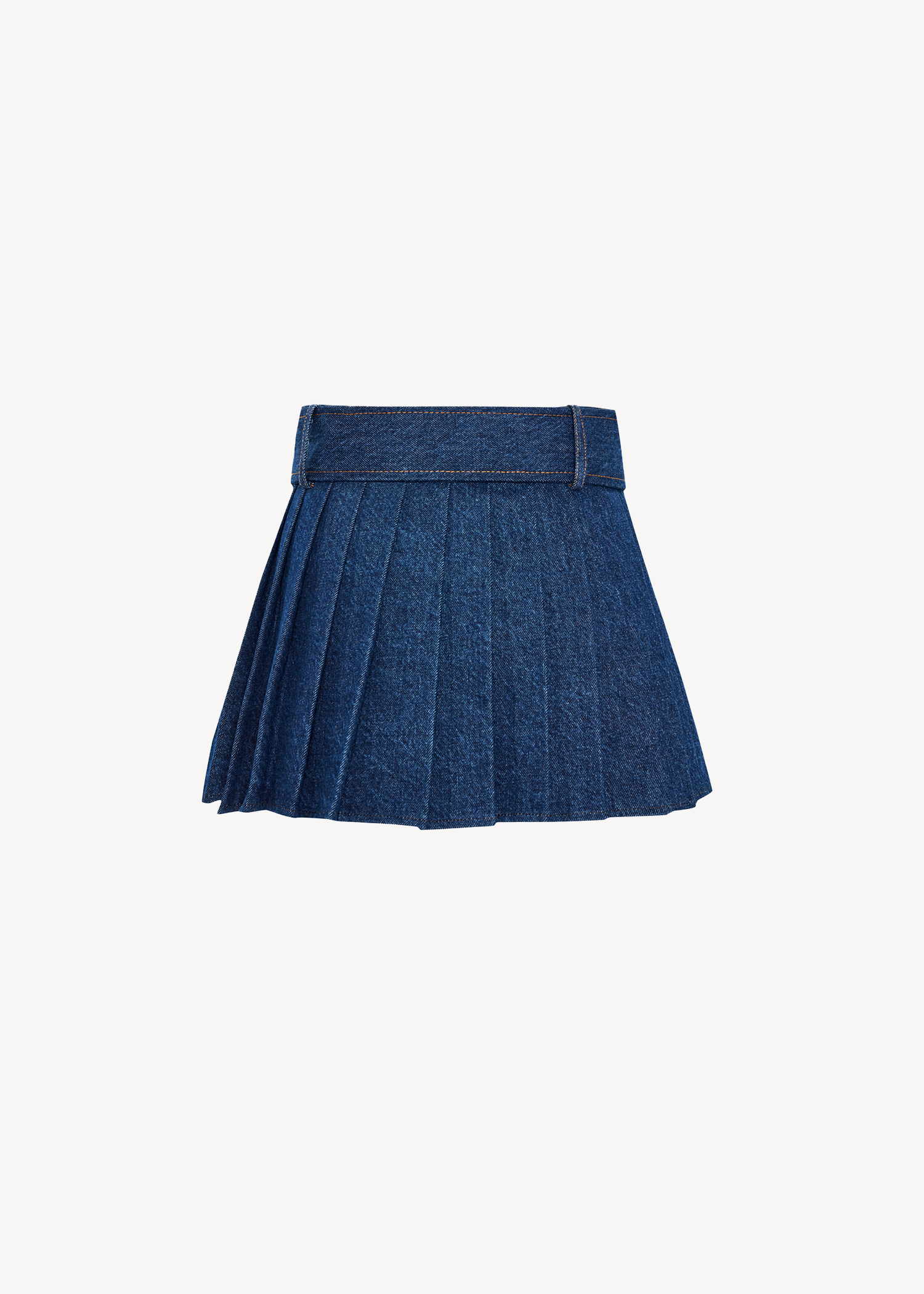 Mimi Mini Skirt, is crafted from navy denim in a pleated mini silhouette. A statement front belt defines the waist, while the side zip fastening ensures a clean finish.